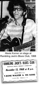 A professional pianist, he had briefly run a small club in Hoddesdon, Hertfordshire, but joined with the Railway Hotel’s landlord, Gary Lane, to open Rambling Jack’s Blues Club on 10 January 1968. Every Wednesday evening, for almost two years, both new and established bands would play here, the most noteworthy names being Dr K’s Blues Band (playing on the opening night), Jack Dupree, Chicken Shack, Jethro Tull, Free, and Alexis Korner (19291984) arguably once the most well known patron of Blues music in this country.